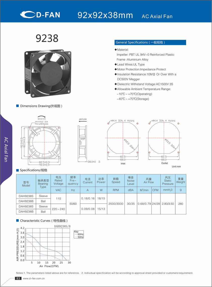 材料: 葉輪:PBT UL 94V-0增強塑料框架鋁合金 導線:UL型 電機保護:阻抗保護 絕緣電阻:1歐姆或以上,帶DC500V高阻表 介電耐壓:AC1500V 3S 允許環(huán)境溫度范圍: -10℃-+70℃(運行) -40℃-+70℃(儲存)